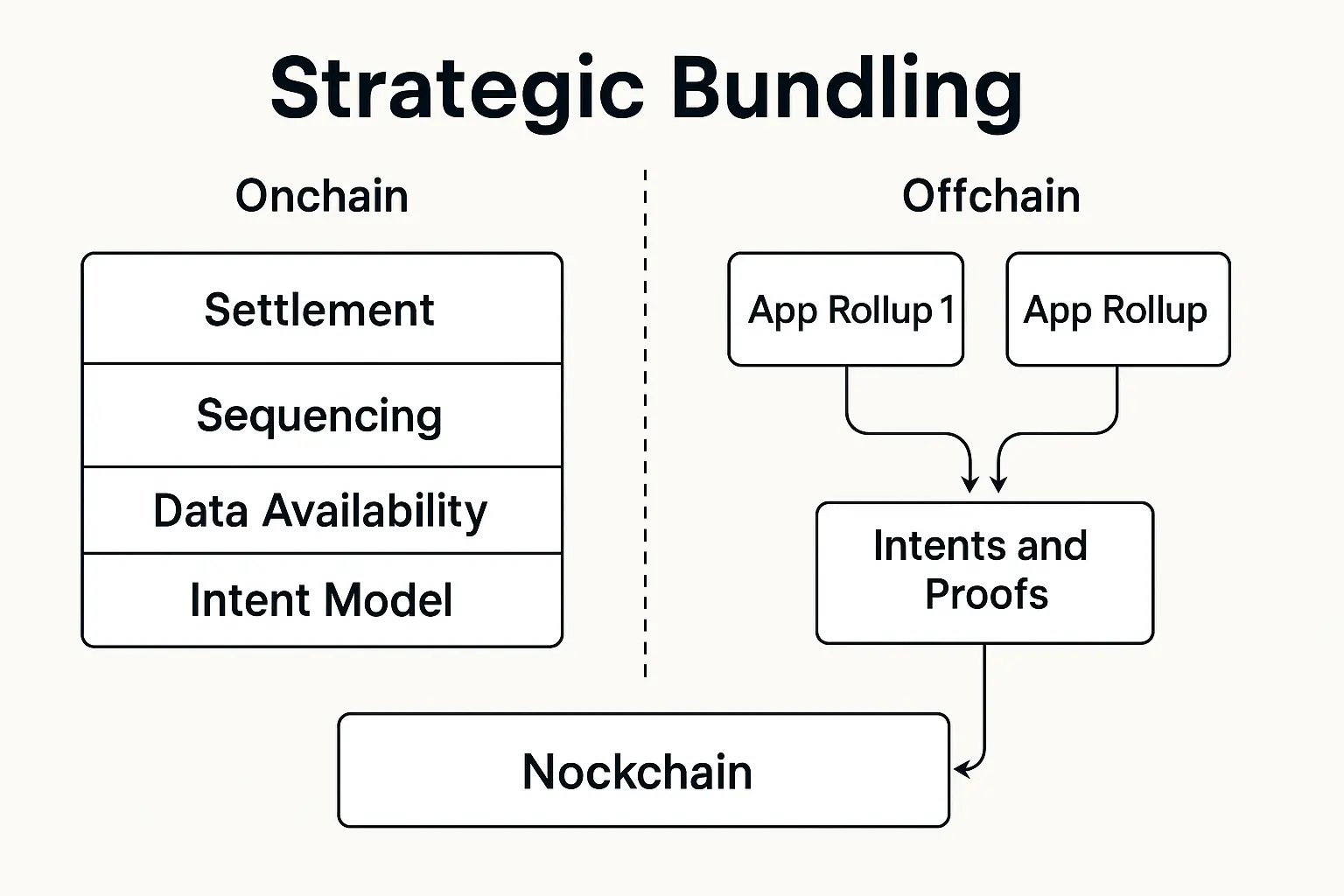 The last decade of blockchain design has been a pendulum swinging between monolithic systems that centralize as they scale and modular stacks that fracture as they grow. Monoliths keep every function—settlement, sequencing, data availability and execution—inside a single chain, so hardware requirements rise linearly with throughput and exclude most validators. Modular architectures split those same functions across multiple networks, lifting raw capacity but introducing multiple tokens, overlapping fees, fragmented liquidity, and a maze of developer choices that erode user experience. Nockchain proposes a middle path of Strategic Bundling: settlement, sequencing, data availability and an intent‑native note model remain onchain, while execution and heavy computation move offchain to app-rollups that return succinct proofs. This approach bounds onchain node workloads without recreating the coordination problems and UX pitfalls of full modularity.